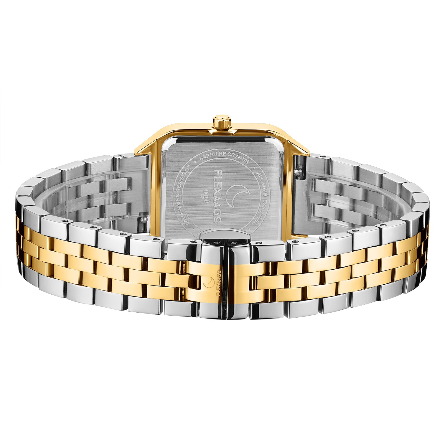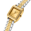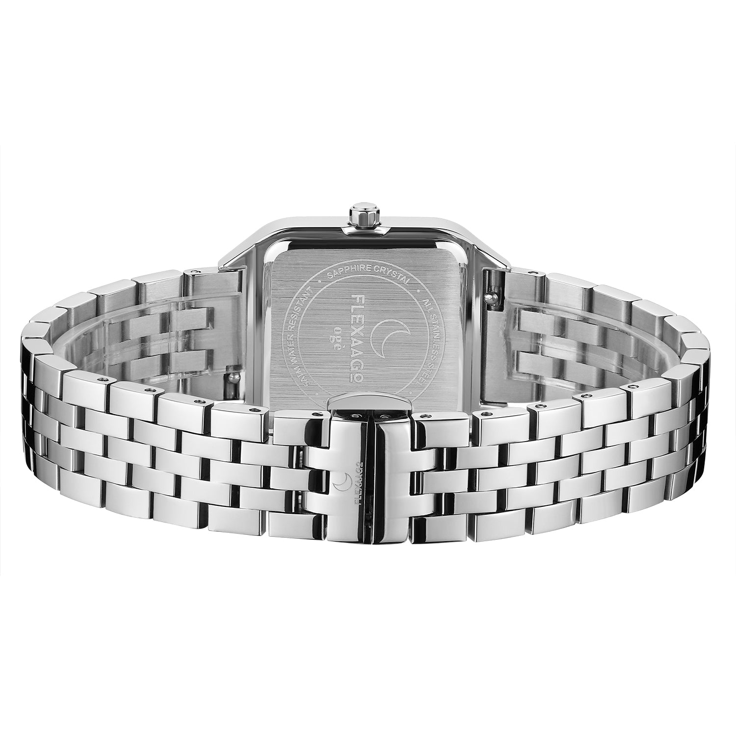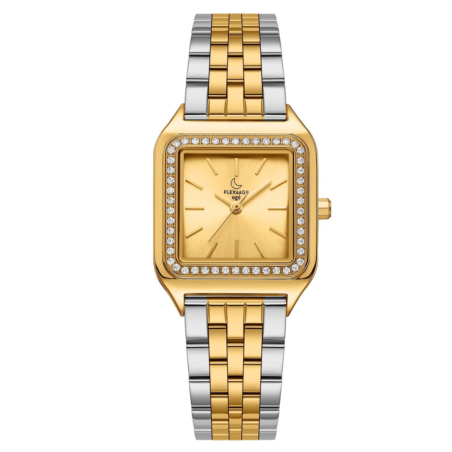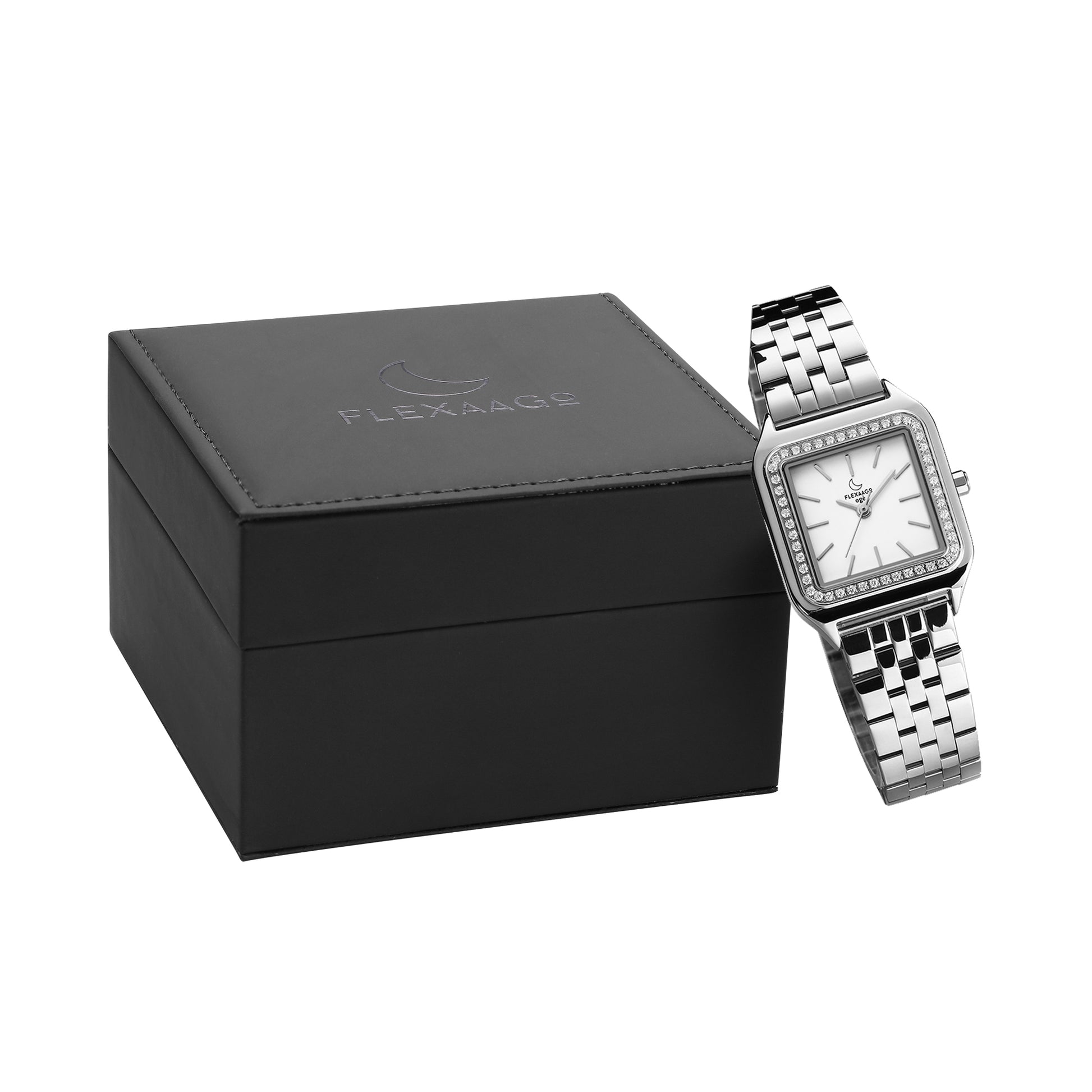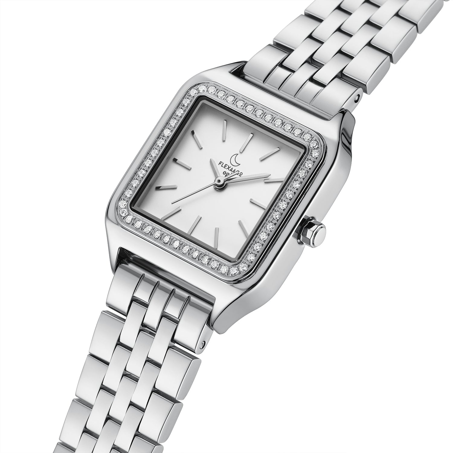 Encased in a 28.5mm square case made of 316L stainless steel and finished with a border of sparkling white stones, it strikes a balance between delicate and bold. As you look through the spotless sapphire crystal glass, it reveals a brushed metal watch face with slender stick hour markers that complement the sophisticated exterior.